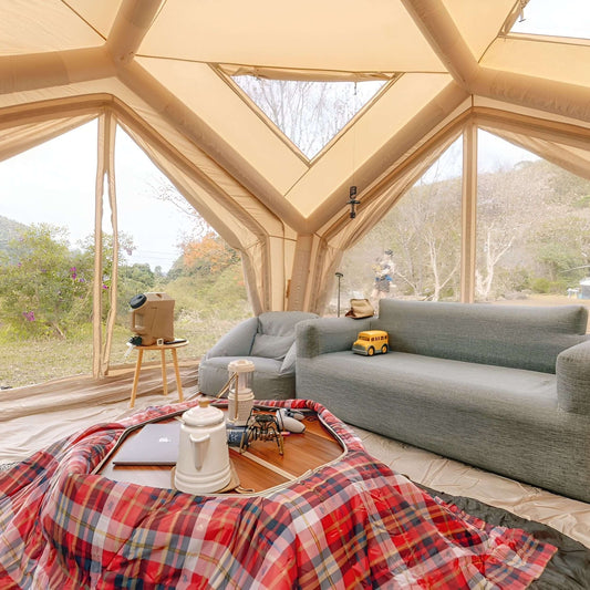 The inflatable tent, a marvel of modern camping gear, promises effortless setup and unparalleled convenience. No longer will you wrestle with complex frames or fear losing essential pegs; with the power of air, your shelter erects itself swiftly. The robust air beams offer stability, resisting winds, while ensuring your tent retains its shape. Light to carry, but strong in use, it's an adventurer's dream. Furthermore, the tent's spacious interior, facilitated by the flexible nature of inflatable support, provides room for comfortable movement and storage. Truly, an inflatable tent revolutionizes the camping experience with its blend of convenience, durability, and comfort.