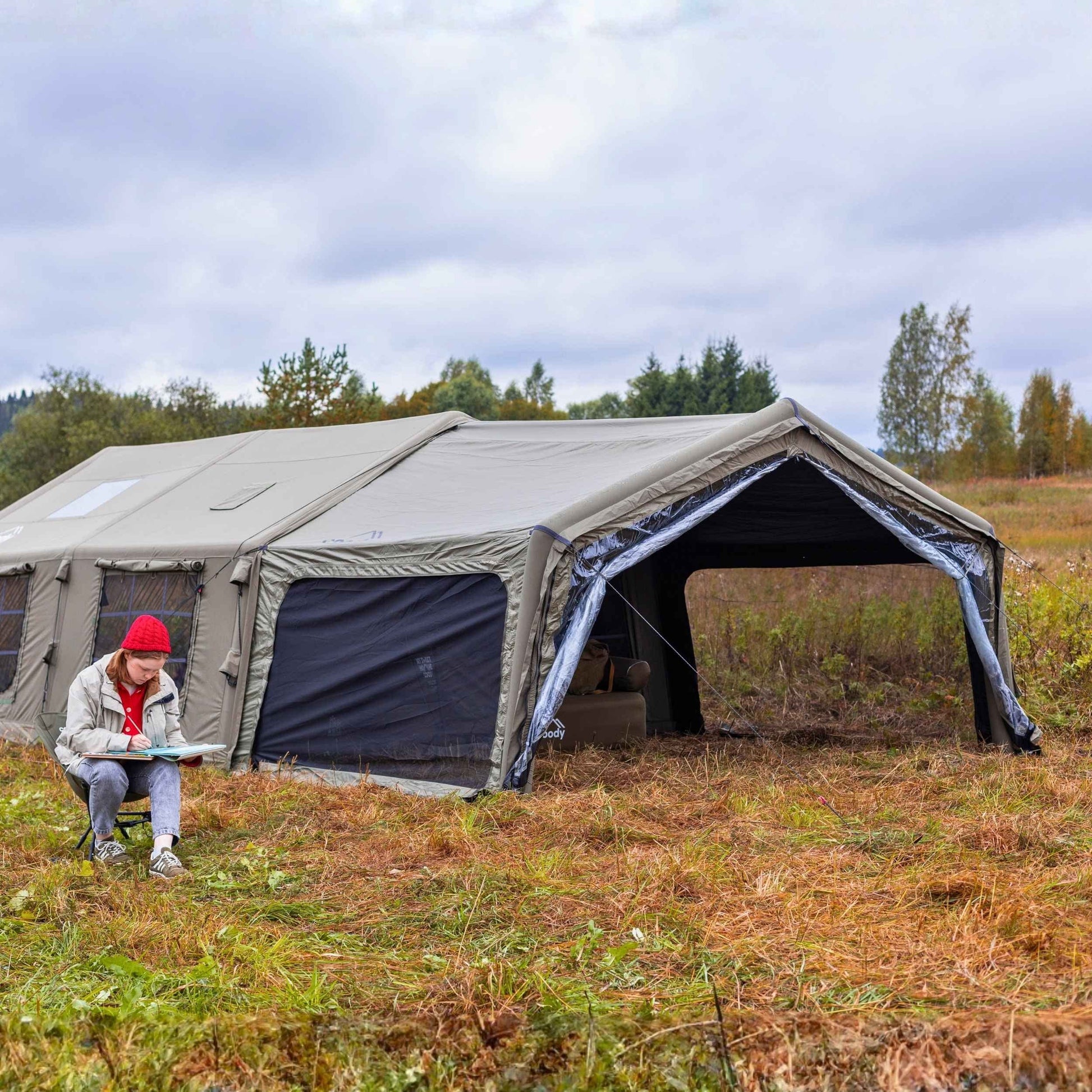 The Coody AirTarp is an inflatable canopy that creates a shaded, weather-protected area in front of your Coody tent. It expands your living space and makes camp setup faster, lighter, and more comfortable.