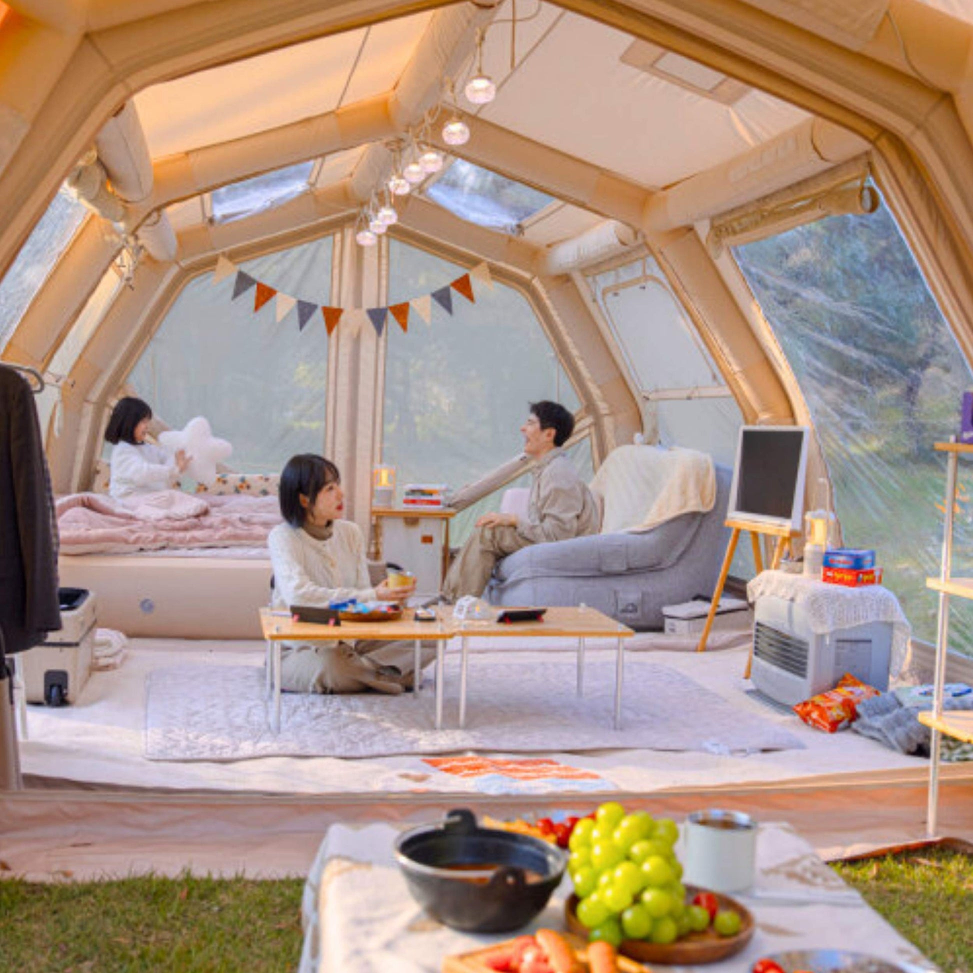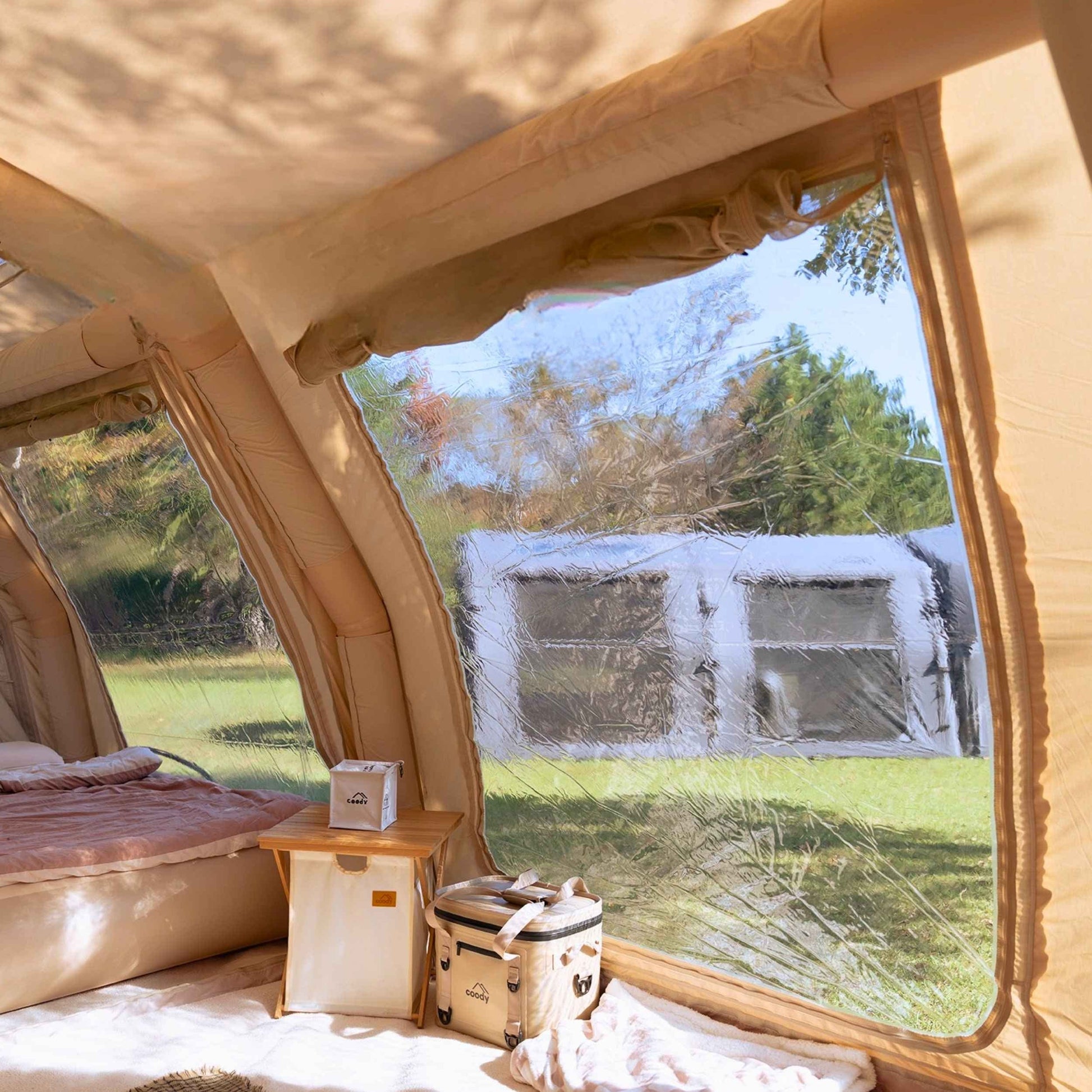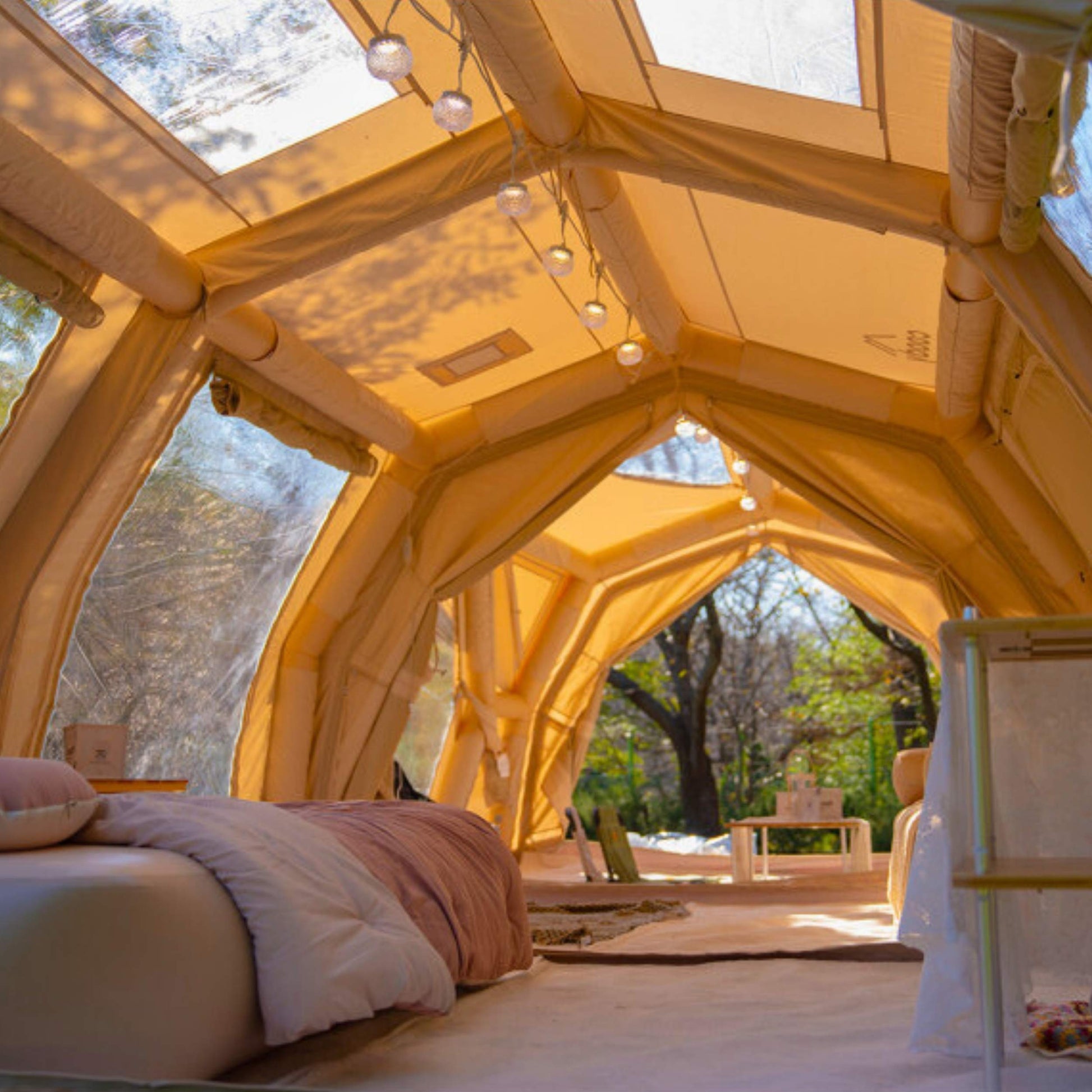 Breathable cotton canvas works together with an intelligent ventilation system to regulate humidity, reduce condensation, and maintain a healthier indoor climate across changing conditions. The inflatable frame maintains vertical tension, keeping the structure stable and spacious over time.