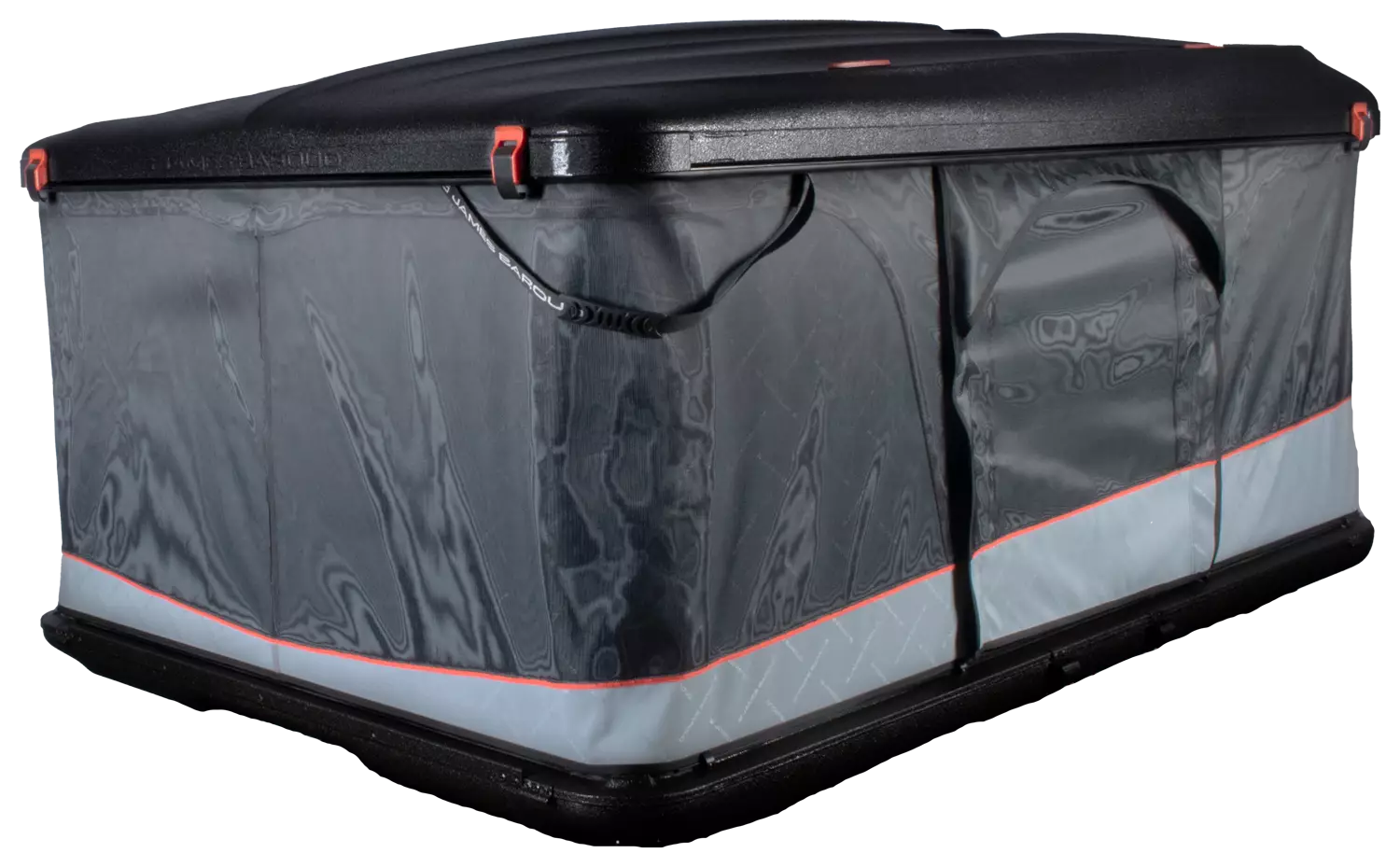 The James Baroud Magma Rooftop Tent is crafted to handle the most extreme environments with its robust, impact-resistant shell. Inspired by volcanic lava, the Line-X coating on the exterior adds a unique texture and exceptional durability, protecting it from harsh weather conditions and rugged terrain. Red accents throughout the tent provide a striking visual contrast, evoking the intense energy of magma and giving the tent a bold aesthetic appeal.