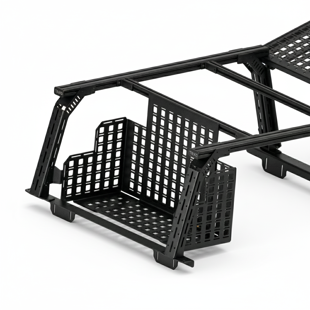 The MSP is available for 24" bed racks. This innovative new accessory from TRUKD allows you to mount jerry cans, Packout Boxes, and Pelican boxes (TX50 or TX80) to the side of your bed rack. Because the entire pod is covered in our unique hole pattern, it allows you to mount gear not only inside the pod but also on the outside of it. The front or back locations are great for fire extinguishers or medical kits. This pod is designed for the ultimate in flexibility!