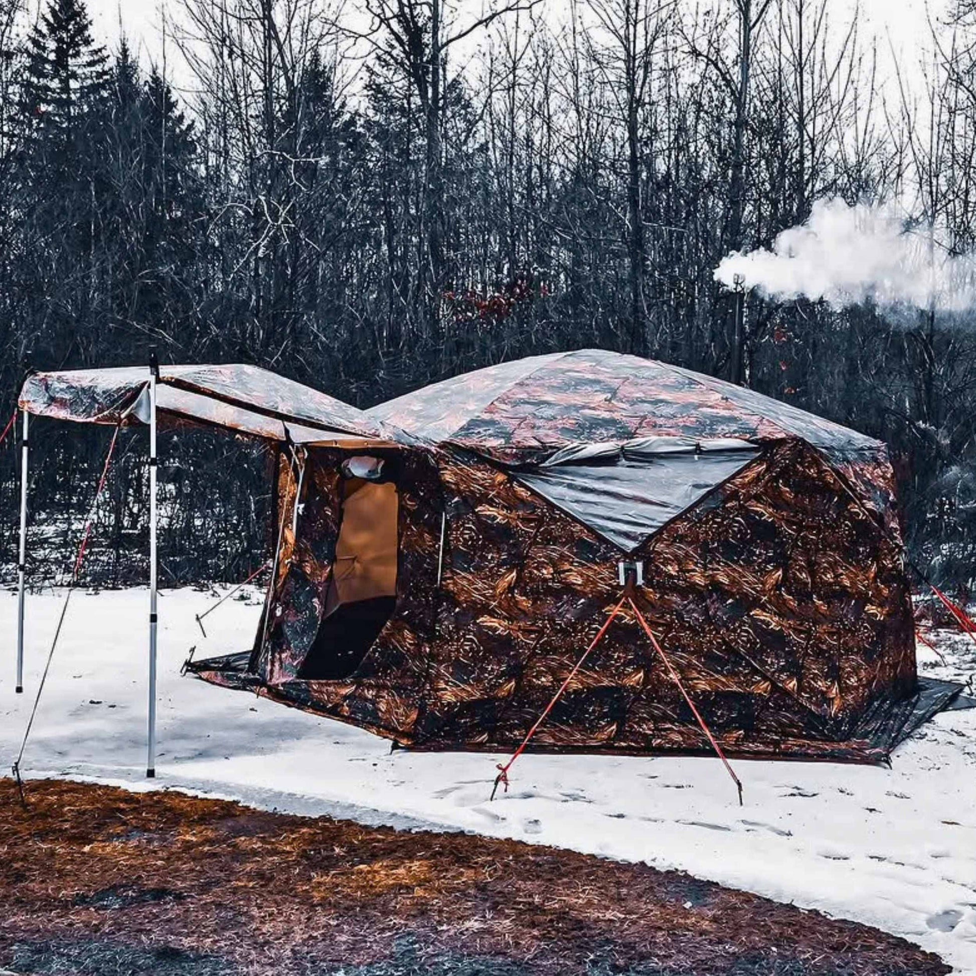 This spacious tent fits up to 9 people and comes equipped with a reliable wood stove for all-weather camping. Double-layered, moisture-resistant fabric ensures warmth and dryness, even in harsh conditions.