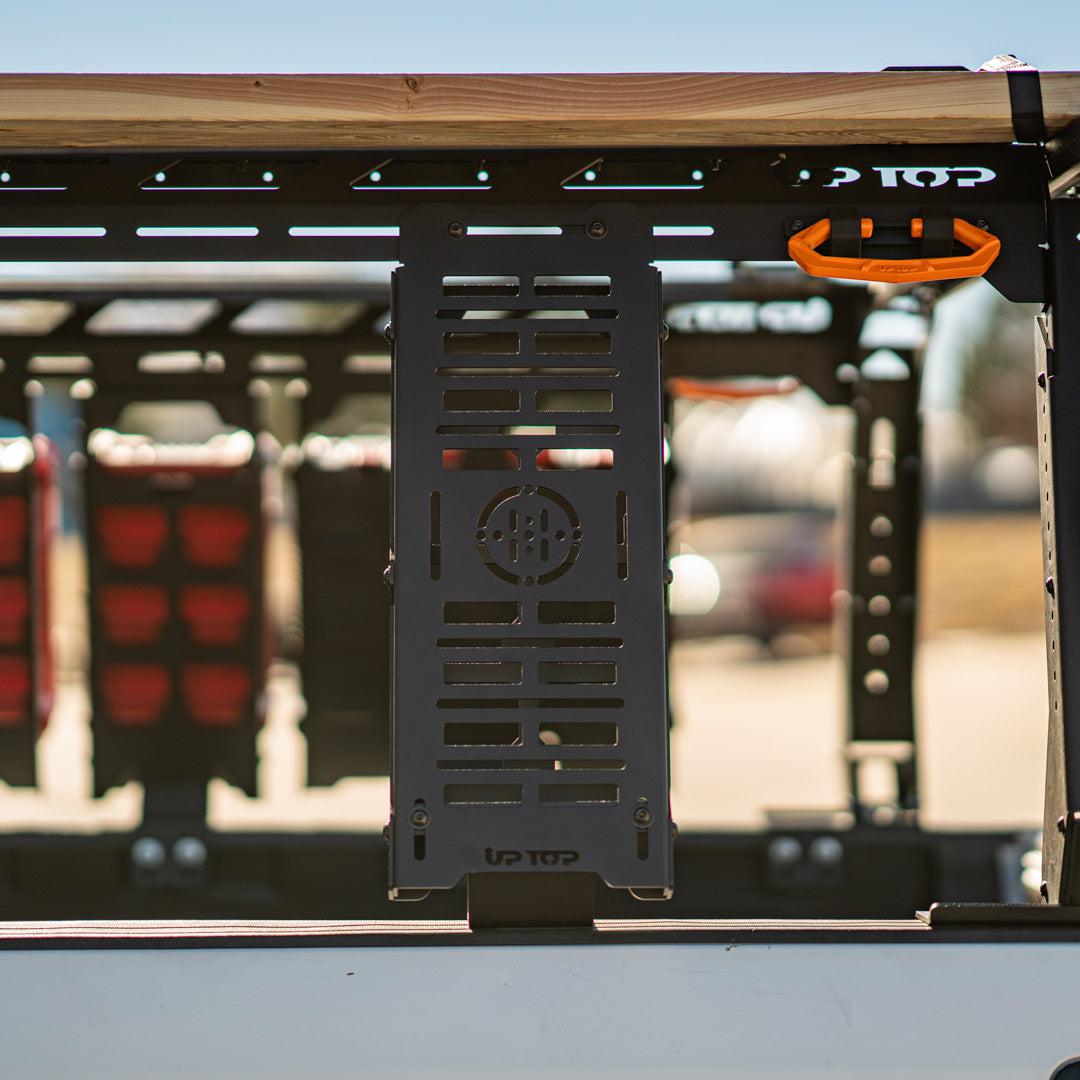 This is a versatile mounting option for miscellaneous gear. It is sized the same as the Compact (half width) Packout Mounts, and compatible with the Compact Backpack Packout Mount. It attaches to the top rail, and bed side, and can be positioned virtually anywhere between the rear and front leg of the rack. How many you can run on each side will depend on your bed length.
