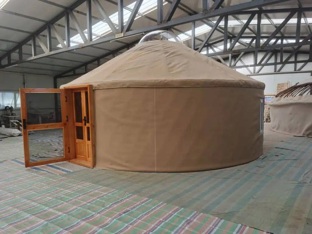 - Four-layer weather-resistant yurt cover (waterproof canvas, wool felt insulation, fireproof thermal insulation, interior liner)